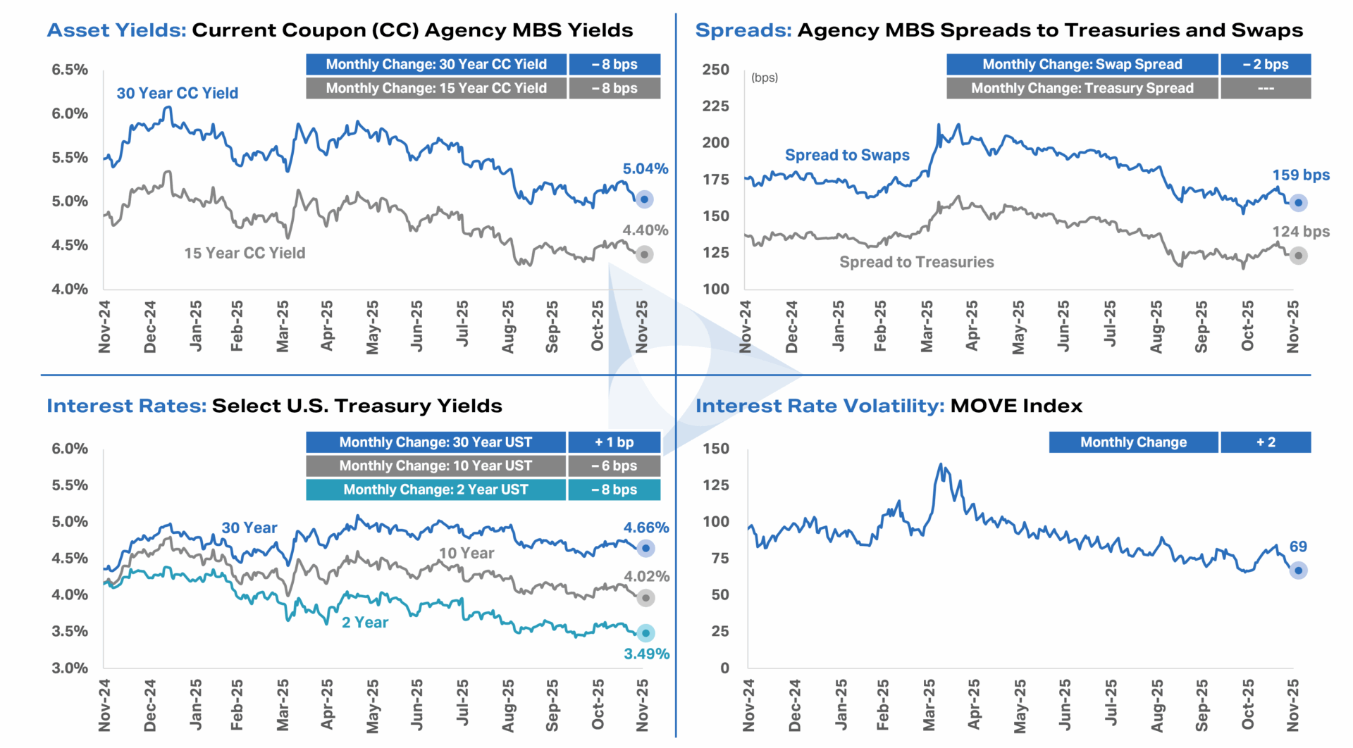 - Uncertainty regarding inflation and the likelihood of near-term Fed rate cuts drove some intra-month volatility across interest rates and Agency MBS spreads, but volatility declined toward the end of November and month-over-month changes in these measures were relatively modest.