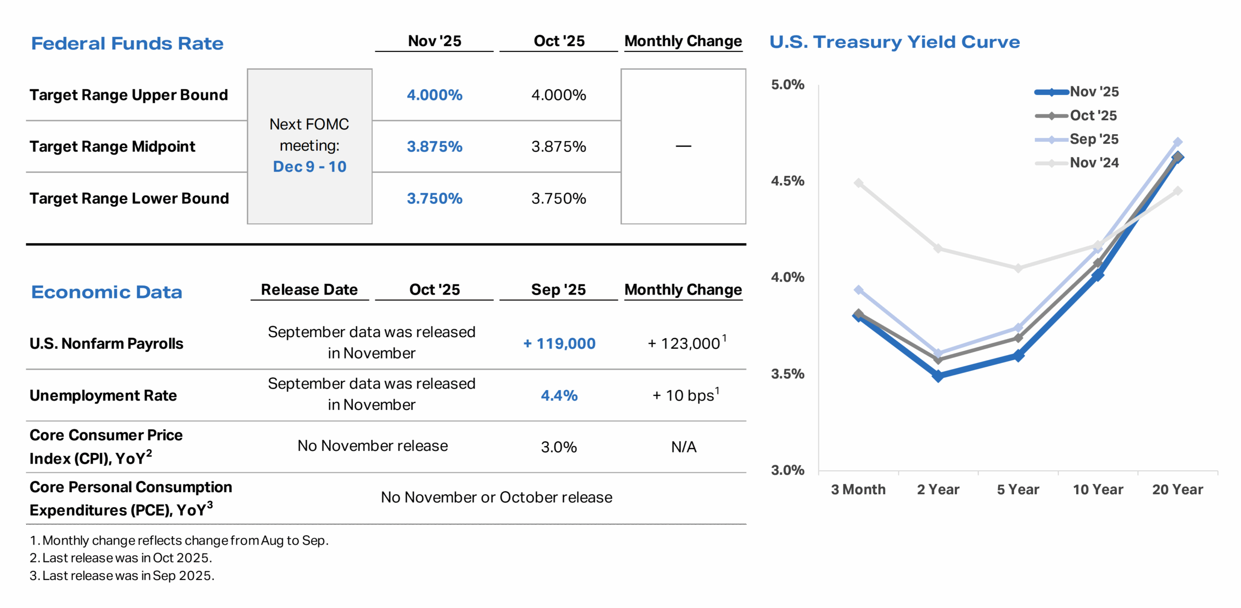 - The federal government shutdown, which ended in mid-November, continued to delay key economic data releases. The most recent federal CPI and PCE reports were released in October and September, respectively.